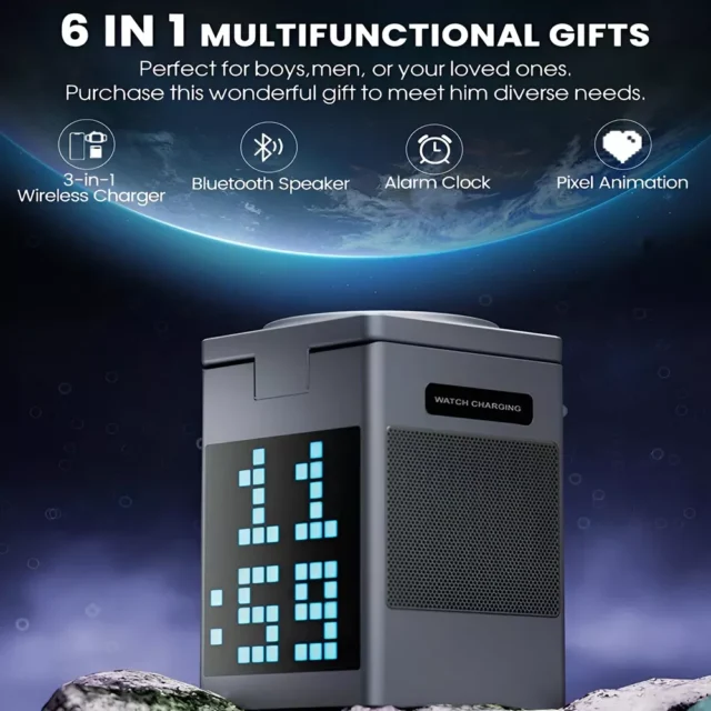 Don’t settle for anything less than the ultimate charging solution. With this 3-in-1 Magnetic Wireless Charging Station with Bluetooth Speaker Alarm Clock, you get fast charging, seamless Bluetooth audio, and an eye-catching display—all in one sleek, modern device. Make your life simpler, your desk cleaner, and your devices powered up. Upgrade your charging station now and experience the next level of convenience!