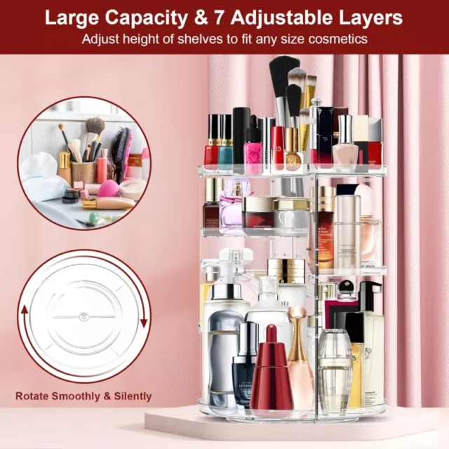 360° Rotating Makeup Organizer with Adjustable Height and Large Storage Capacity