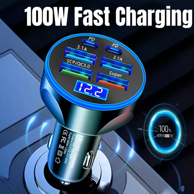 6-Port 100W USB C Car Charger with Voltage Display and Fast Charging