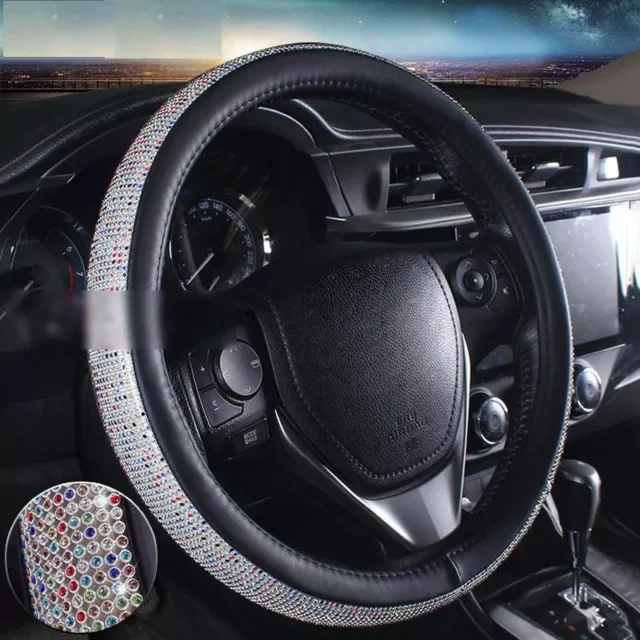 This steering wheel cover isn’t just a pretty addition to your car—it’s packed with practical benefits. The PU leather material protects your steering wheel from wear and tear caused by daily use, while the rhinestone design enhances grip for better control and added safety. Its universal fit makes it an easy upgrade for most vehicles, and the secure rubber lining keeps it firmly in place. The rhinestones are expertly set, ensuring they won’t fall off even after extensive use, making it as durable as it is dazzling.