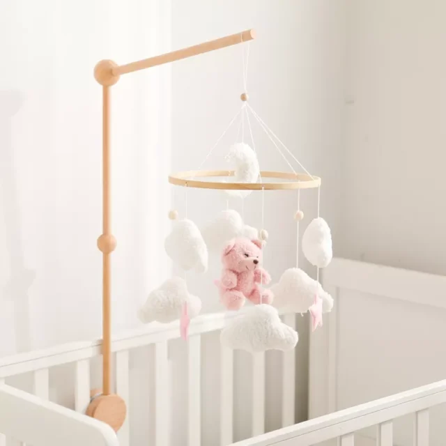 Wooden Baby Crib Mobile with Soft Pink Bear Rattles and Musical Hanging